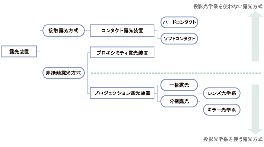 プロジェクション露光には、投影光学系の違いにより、レンズプロジェクション露光とミラープロジェクション露光の2種類がある。これらはマスクとワークが非接触なため、両者のダメージが非常に少ないほか、縮小光学系(例えば、マスクの原画のサイズが5に対し、ワークの像のサイズが1の場合、これを5:1縮小系と言う。投影倍率5:1とも言う)を用いることで、マスクの像の精密転写が可能など、大きな特長を備える。