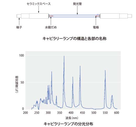 キャピラリーランプとは、一般には内径1~2mm、長さ数10~数100mmの石英ガラス製の直管形発光管内に、始動用の希ガスと発光用の水銀が封入されているランプのこと。