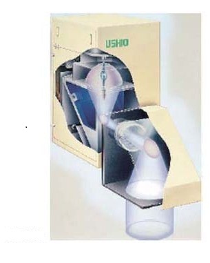 長寿命で安定した照射強度の超高圧UVランプをはじめ、ワークへの熱影響を軽減するコールドミラー、均一で高精度のをつくるインテグレータレンズなどが組み込まれ、光学設計が施されている。
