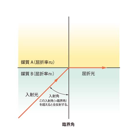 臨界角 critical angle りんかいかく 解説 臨界角とは、その入射角を超えると全反射する最小の入射角のこと。 ※媒質(屈折率n1)から媒質(屈折率n2)に光が入るとき、臨界角はθ=arc・sin(n2/n1)で表される。 ※導光板に使われるアクリル(屈折率n1=1.49)から空気(屈折率n2=1)に光が入るとき、臨界角はθ=arc・sin(1/1.49)=42.2°である。 関連用語 光 関連製品 関連URL 付属資料 用語50音一覧 あ行 か行 さ行 た行 な行 は行 ま行 や行 ら行 わ行
