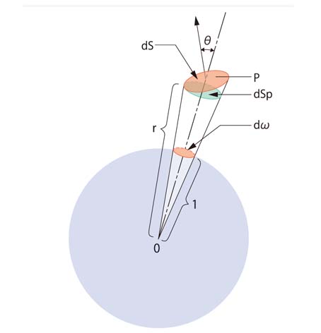 図の点Oから r だけ離れた位置Pにある微小面dSについて、点Oから見た立体角はdSと点Oとを結ぶ直線に垂直な面上へのdSの射影をdSpとするとき、dSp/r2で与えられる。