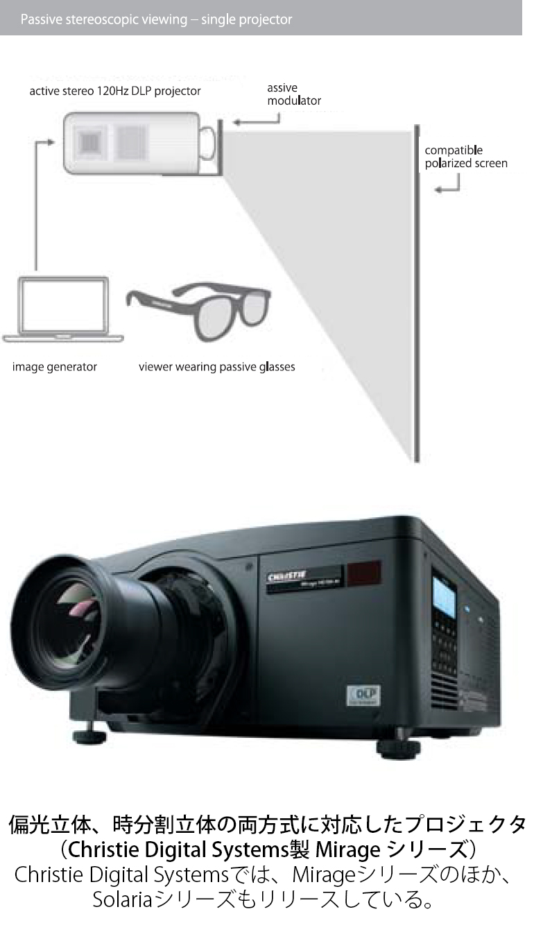 ※時分割立体方式は、まず、コンピュータ、映像サーバ、BluRay等で、映像ソース側から左右の視差を変えた「左目用」と「右目用」の映像を1秒間に48~120回の速度で、交互に3Dプロジェクタに送出し、3Dプロジェクタ側は、場合によって、映像を増幅し、左右の映像をスクリーンに投影する。次に、プロジェクタから同期信号を受けた赤外線発光装置(エミッタ)が特定の空間に赤外線を出し、この赤外線信号受信器を内蔵した3Dメガネ(液晶シャッタメガネ)が、左右の映像が投影されるタイミングに同期を合わせて、メガネの左右の液晶を「ON/OFF(開閉)」にする。これにより、右目には右目だけの映像が、左目には左目だけの映像が見える仕組みとなる。