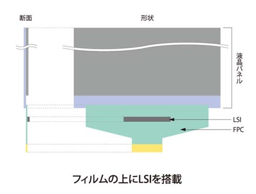 COFとは、「Chip on Film」または「Chip on Flexible」の略称で、ポリイミドからなるフィルム状の配線回路基板の上に半導体チップ(ドライバIC)を実装する技術のこと。フィルムの上に半導体チップを実装することから、COFと呼ばれている。