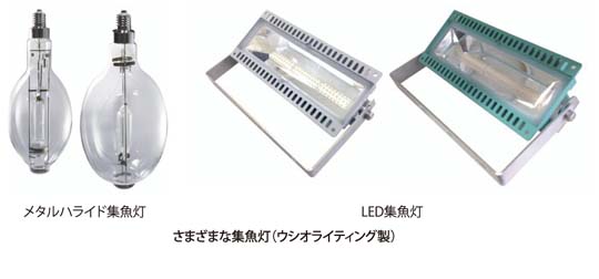 集魚灯 fish lamp、fishing lamp、fishing light しゅうぎょとう 解説 集魚灯とは、夜間に、イカやサンマなどの魚類を光で誘い集めて捕獲する漁業用の照明器具のこと。 ※昔は漁火(いさりび)と言われ、たいまつなどが用いられたが、その後、白熱電球、ハロゲン電球、放電ランプが使われ、最近では、省エネ効果の大きい発光ダイオード(LED)も使われ始めている。 関連用語 白熱電球 発光ダイオード ハロゲン電球 光 放電ランプ 関連製品 関連URL 付属資料 用語50音一覧 あ行 か行 さ行 た行 な行 は行 ま行 や行 ら行 わ行