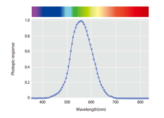 横軸は光放射の波長(nm)、 縦軸は波長:555nm の単色放射に対して感ずる明るさを 1 として正規化した時の、その他の波長で感ずる同じ放射強度の明るさの比、という形で表されている。これによると、 例えば波長:470nm の光は、物理的には同じ放射強度であっても、波長:555nm の光の約10分の1 の明るさにしか感じないことになる。