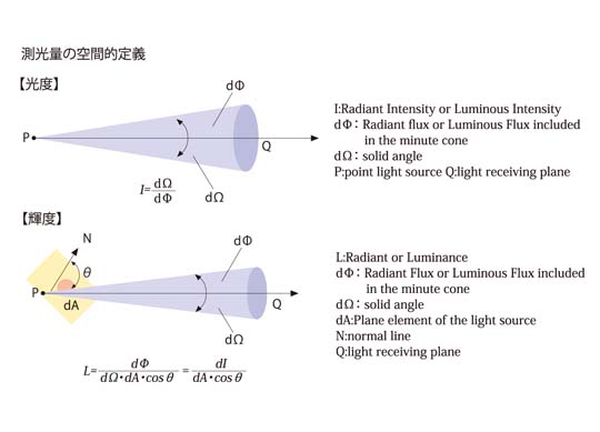 測光量の場合、基本となるのは放射量での「放射束」に対応する「光束(luminous flux)」であり、光束の立体角密度として「光度(luminous intensity)」が表される。(光度は放射量の放射強度に対応する量)同様にして「輝度(luminance)」や「照度(illuminance)」が定義されている。