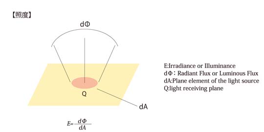 測光量の主な用語として光束(luminous flux)、光度(luminous intensity)、輝度(luminance)、照度(illuminance)などがある。