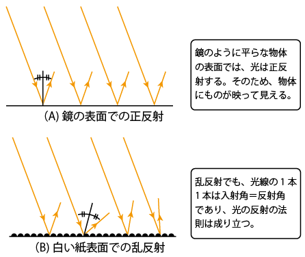これに対して、拡散反射は入射光が様々な方向に反射されることを言う。