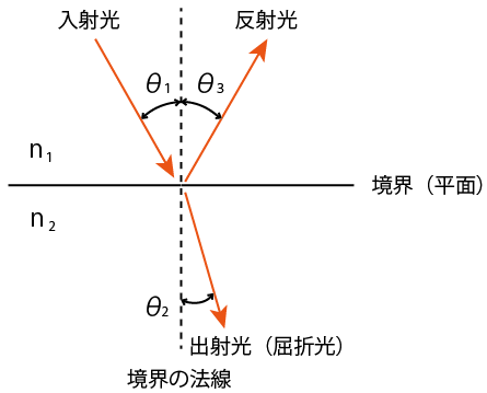 下図のように、光線の入射角をθ 1 、出射角(屈折角)をθ 2 、反射角、入射側の媒質の屈折率をn1 、出射側の媒質の屈折率をn2 とすると、スネルの法則は、