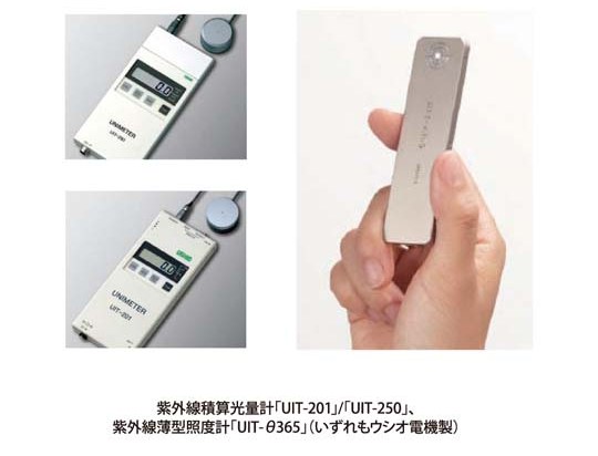紫外線照度計 ultraviolet irradiance meter、ultraviolet irradiance photometer しがいせんしょうどけい 解説 紫外線照度計とは、超高圧水銀ランプや高圧水銀ランプなどが放射する紫外域の特定波長のエネルギーを測定する計測器のこと。 代表的な波長である365、405、436nm等の放射照度や積算光量を測定することができる。測定値は単位面積当たりの放射照度で表し、単位はW・m-2を用いる。また、積算光量は一定時間に照射された光の積算量であり、単位はJ・m-2を用いる。 関連用語 高圧水銀ランプ(高圧UVランプ) 超高圧水銀ランプ(超高圧UVランプ) 波長 光 放射照度 関連製品 関連URL 付属資料 用語50音一覧 あ行 か行 さ行 た行 な行 は行 ま行 や行 ら行 わ行