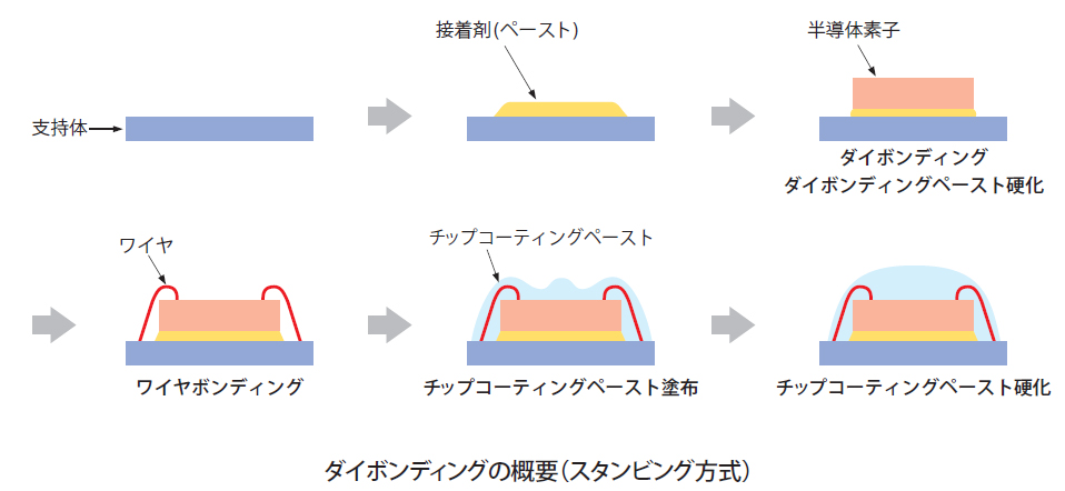 ダイボンディング die bonding だいぼんでぃんぐ 解説 ダイボンディングとは、個片となった半導体素子(Die)をダイボンダ装置によりピックアップし、支持体に銀ペーストなどの接着剤を塗布して、その上に固着する工程のこと。ダイアタッチ、チップボンディングとも言う。 関連用語 関連製品 関連URL 付属資料 用語50音一覧 あ行 か行 さ行 た行 な行 は行 ま行 や行 ら行 わ行