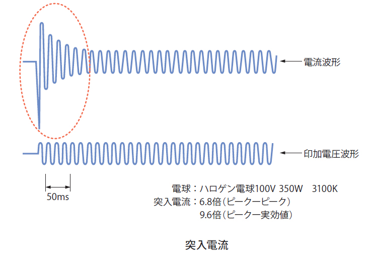 ※一般家庭用の白熱電球などでも、ハロゲン電球ほど電流値は大きくないが、同様な突入電流を生じる。