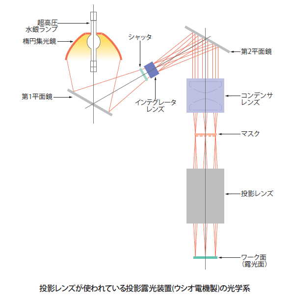 プロジェクタやステッパなどで使われるが、レンズのタイプは単レンズからステッパのように20枚以上あるものまで、さまざまである。