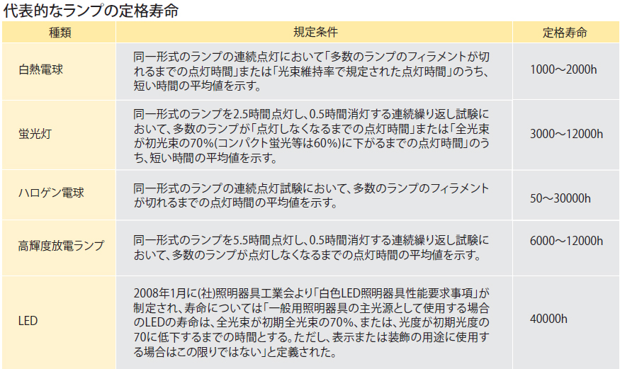 定格寿命(ランプの) rated life(of lamp) ていかくじゅみょう(らんぷの) 解説 定格寿命(ランプの)とは、いわゆるランプの寿命のことで、規定条件で試験したときのランプの平均寿命値を言う。 →寿命(ランプの)を参照。 ※規定条件はランプの種類やメーカーによって異なり、また、ランプの寿命は、使い方や利用環境によって、ある程度変わってくる。このため、定格寿命は、標準的な利用法においてのメーカーが公表する数値であり、カタログにはこの数値が記載される。しかし、あくまでも平均値であることから、平均寿命と記載されることもある。 関連用語 寿命(ランプの) ランプ 関連製品 関連URL 付属資料 用語50音一覧 あ行 か行 さ行 た行 な行 は行 ま行 や行 ら行 わ行