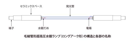 発光管(棒状の石英ガラス管)の両端に、一対の電極が配置されている。点灯中の水銀の蒸気圧は5×106~2×107Paにも達する。ランプは強制空冷または水冷される。毛細管形超高圧水銀ランプ(キャピラリーランプ)はロングアーク形である。CRTの蛍光体焼付、製版、半導体・ICなどのフォトエッチングなどに使用される。