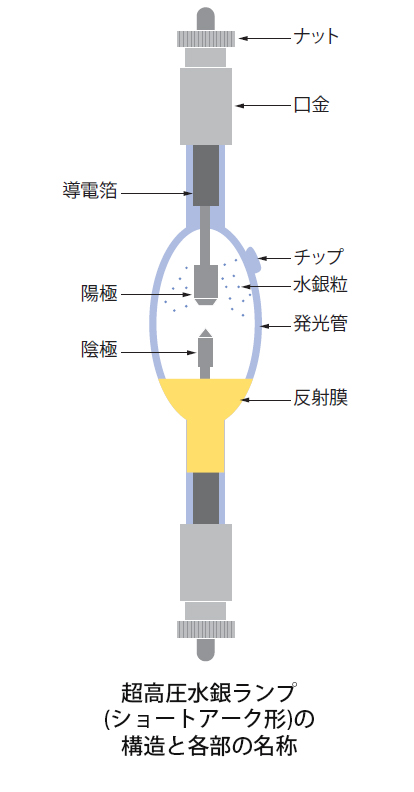 発光管(石英ガラス球)の中央付近に、一対の電極が短い間隔で配置され、その中に水銀が封入されている。点灯中の水銀の蒸気圧は 106~2×107Paにも達し、高輝度の点光源となる。