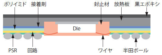テープBGA tape ball grid array てーぷびーじーえー 解説 テープBGA(TBGA)とは、TABテープを使ったBGAパッケージのこと。 TABテープには放熱板が組み合わせてあり、半導体集積回路の発生する熱は、放熱板を通して積極的に放出される。これにより、薄くて耐熱性の高いパッケージを形成することができ、高性能の半導体集積回路を実装することが可能となった。ただし、TABテープは多層化が難しいことから、ピン数の多い半導体の実装は困難とされている。 →TAB、TABテープ、BGAを参照。 関連用語 TAB TABテープ BGA 関連製品 関連URL 付属資料 用語50音一覧 あ行 か行 さ行 た行 な行 は行 ま行 や行 ら行 わ行