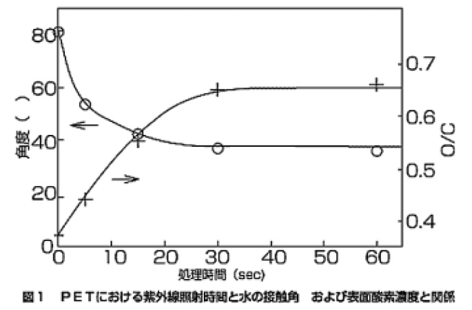 図1に結果を示す。接触角は処理前の80度から5秒照射で50度、15秒後は40度と変化した。ESCAで表面の酸素濃度(O/C)を測定したところ接触角とよく相関があり、親水基が表面に導入されたため接触角が低下したと考える。この改質の速度は、J.Peelingら1)の低圧水銀灯の照射実験に比較し、40度までの接触角変化に要する時間が1/10以下であった。