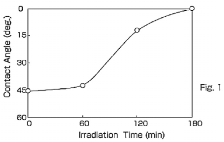 水を介して、ポリイミドフィルムに真空紫外ランプを0~3分間照射した。これによって、改質された試料の親水性を、水との接触角の測定から評価した。その接触角のランプ照射時間依存性をFig.1に示す。この図から、ランプ光を3分間照射することによって、接触角はほぼ0度となることがわかった。