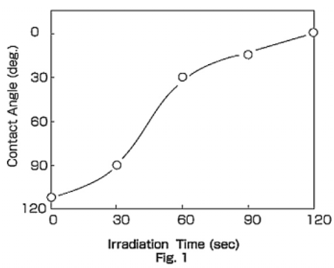 水を介して、テフロンフィルムに真空紫外ランプを0~2分間照射した。そして、改質された表面の水との接触角を測定し、試料の親水性を評価した。その結果をFig.1に示す。2分のランプ照射時間によって、接触角はほぼ0度となり、強い親水性を発現することができた。