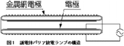 希ガス中で誘電体バリア放電を行うと、希ガスエキシマからの放射が得られることは、かなり古くから知られていたが3)、近年、U.Kogelschatz等は、希ガスエキシマに加え、ハロゲン、希ガス/ハロゲン、希ガス/水銀、水銀/ハロゲンのエキシマ発光について幅広い研究を行い、その応用研究も行っている4)。しかし、誘電体バリア放電の条件や光出力の詳細については、必ずしも明確にはされていない。