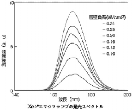 キセノンの圧力10kPa以上においては、172nmに最大値を有し、半値幅が約15nmである単色光的な放射が得られた(他の波長領域における放射は非常に少なかった)。また、このスペクトルの形は入力電力によってほとんど変わらなかった(図2参照)。誘電体バリア放電ランプの電気特性、効率等の詳細などについては、講演で報告する。