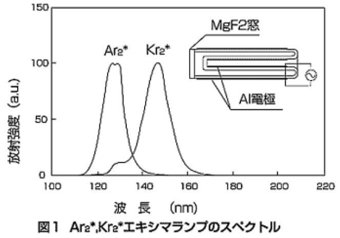そこで今回報告するランプは、図1に示される様に放電円筒管端面に窓材としてふっ化マグネシウム(MgF2)を用い、その他は従来のランプとほぼ同様の構造を持つ。