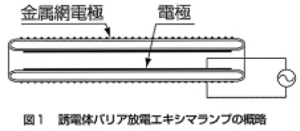 同軸円筒型の誘電体バリア放電Xe2*エキシマランプにおいて、ランプ入力電力約20Wで、エキシマ光の全放射束は約2W、効率約10%が得られた。
