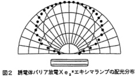 ランプ入力電力が約20W、電界強度をキセノンの圧力で除した値が50V/cm/kPa時の誘電体バリア放電Xe2*エキシマランプの配光分布を図2に示す。完全拡散放射源からずれた配光分布となった。その時のエキシマの光の全放射束を見積もると約2Wであり、効率約10%が得られた。