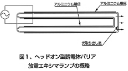 ランプ形状の自由度が大きい利点を生かしてヘッドオン型誘電体バリアランプを開発した。光取り出し窓から100mmのところで放射照度はサイドオン型の約5倍になった。