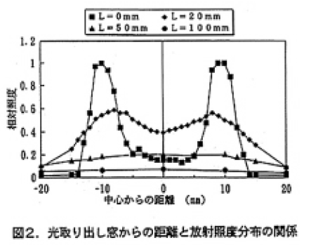 放電用ガスとして約40kPaのXeを使用した結果、中心波長172nm、半値幅14nmの単色光的なエキシマ光が得られた。図2に光取り出し窓からの距離と放射照度分布の関係を示す。試料ランプは外径:25mm、放電ギャップ長:4.5mm、電極長さ:130mmである。光取り出し窓からの距離が100mmにおける放射照度は、照度のピーク値を100%とした場合、相対照度80%の範囲は直径30mmの円となった。また、100mmの位置における平均の放射照度は同軸円筒型を使用した場合の約5倍になった。