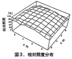 本装置は電源、照射ユニット、ランプユニットで構成する。照射装置の外観を図1に示す。照射ユニットの照射口は100×100mmであり、石英ガラスを通して光を取り出す。内蔵するランプは、中心波長が308nm、半値全幅2nmの光を照射し、照射窓(石英ガラスの外側)での放射照度は約10mW/cm2である。ランプユニットの反射鏡の形状を図2に示す。本ランプは、比較的大きな表面積を有する。従って、ランプ表面から放射された光を有効に利用するための反射鏡を設計した。このため、広い面積を均一な照度で照射する事が出来た。照度のピーク値を100%とした時の相対照度分布を図3に示す。相対照度80%の範囲は約70×70mmであった。