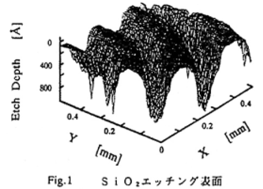 SiO2基板が存在する反応セル内に、CHClF2ガスを封入する。ここに、172nmランプを照射する。この照射により光分解したCF2*が(CF2)nとして基板表面に極薄い膜層となって堆積する。同時に、基板に対し垂直方向よりレチクルを介し、パターン状になったKrFエキシマレーザーを(CF2)n膜へ照射する。Fig.1にSiO2エッチング表面を示す。この時の条件は、CHClF2 400Torr,KrFエキシマレーザーのエネルギー密度270mJ/cm2であり、エッチング深さは、約800Åであった。