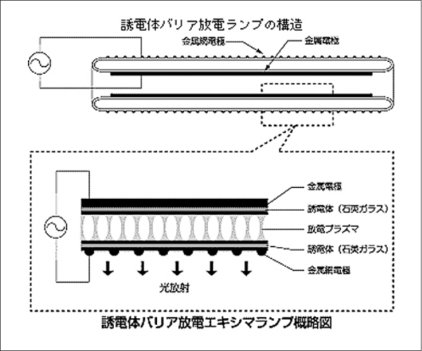 ランプは石英ガラスの二重構造になっており、内管の内側に金属電極(アルミ蒸着電極)、外管の外側に金属網電極がそれぞれ施されています。また石英ガラス管内には、放電ガスが充填されています。