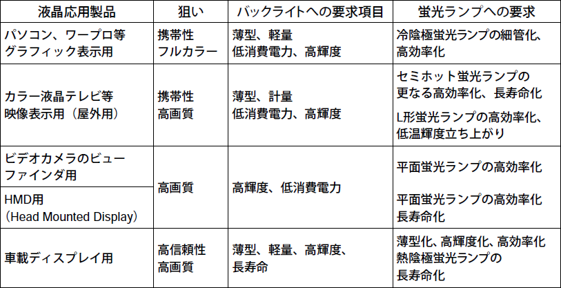 液晶ディスプレイの応用市場 及び個人向け市場の拡大には、低コスト化が必須条件である。そのため、どの用途のバックライトにも共通する要求は低コスト化であるが、ここでは、性能について述べている。