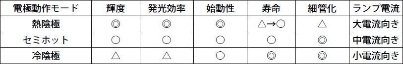 セミホット蛍光ランプは熱陰極蛍光ランプの細管化、長寿命化の取り組みの中から誕生した4)16)。熱陰極蛍光ランプの高輝度、高効率と冷陰極蛍光ランプの細管、超寿命を兼ね備えている。熱陰極、セミホット、冷陰極の各蛍光ランプの特徴を第2表に示す。