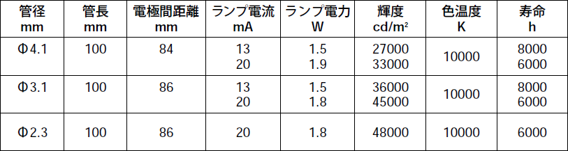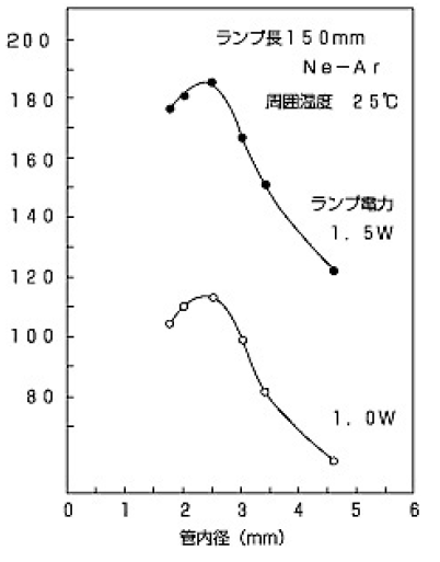 液晶ビューファィンダ用では、外径2.6mm、管長30mmの細管冷陰極蛍光ランプが開発されているが、管長30mmの場合は管内径縮小による陽光柱入力の上昇率が大きくなると考えられ、管内径2mm以下でもまだ発光効率が高くなるという報告がある14)