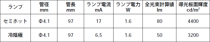 φ4.1セミホット蛍光ランプを4インチ用導光板に組み込んだバックライ卜の輝度をφ4.1冷陰極蛍光ランプのそれと比較して、第4表に示す。輝度アップシートは使用していない。ランプ電力を同じくするために、冷陰極蛍光ランプにはランプ電流6.5mA流している。セミホット蛍光ランプを使用した時の導光板面上の輝度は約4400cd/m2、冷陰極蛍光ランプでは約3200cd/m2。セミホット蛍光ランプの方が約38%高くなっているが、ランプ全光束のアップ分約60%高くならないのは、組み込んだ時のランプの最冷点の最適化に課題を残しているためと考えている。なお、この使用では寿命末期の管壁温度対策を実施している。