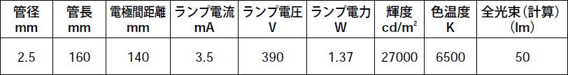 第5表 Φ2.5冷陰極蛍光ランプの特性