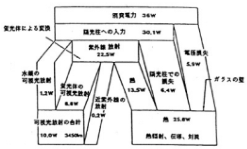 第2図 省電力設計の40W形直管蛍光ランプ10)(管径25mmの消費電力36W)のエネルギーバランス
