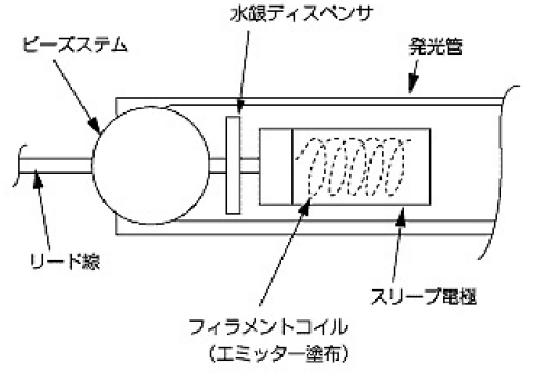一般的に、蛍光ランプは管内壁に蛍光体が塗布され、管両端に電極が取り付けられ、バッファーガスとしてのArと適量の水銀が封入されている。冷陰極はニッケル、ステンレス、あるいは鉄等の金属の板状、棒状、あるいは筒状(以下、スリーブという)の構造をしている。管両端の電極間に高電圧を印加すると、管内に残存する電子が陽極に引かれて高速に移動する間にArと衝突。衝突電離増殖した陽イオンが陰極に衝突し、陰極から2次電子をたたき出して放電が開始する。放電により流れる電子は水銀原子と衝突。励起した水銀が紫外線を放射、この紫外線が蛍光体を励起し、蛍光体固有の可視光線を発光する。