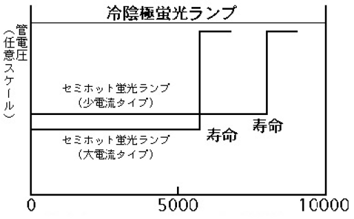 • ②定電力インバータと組み合わせて、冷陰極動作に移行した時点で冷陰極並みのランプ電流値に絞る。その時間までは低消費電力に寄与するがその後は冷陰極並みの消費電力にする。この結果、管壁温度は冷陰極の場合以上には上昇しない。