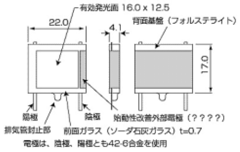 発光効率改善で細管化の限界がみえてきた現在、電極構造へのアプローチが検討されている。課題はγ作用の大きい電極の開発である。2次電子放出係数γは電極の材質及び形状に依存する。平行平板電極のホロー効果で陰極降下電圧を低減した報告がある18)。スリーブ電極も同じ効果を狙っている。仕事関数の小さな金属はγが大きいと考えられ、実際に仕事関数の小さな金属程陰極降下電圧は低い15)。エミッターをスリーブ電極に塗布焼付けしたり、エミッターをコイルに保持させたり、エミッター含侵焼結電極等、エミッターの利用によりγ作用増大を狙っている。エミッター含侵焼結電極をスリーブ状電極(カップ電極)に収納した構造で陰極降下電圧約50Vを得たとの報告がある19)