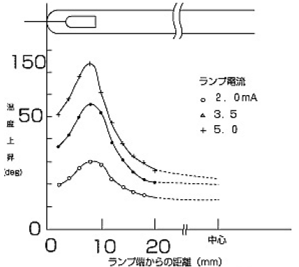 しかし、寿命末期には冷陰極動作に移行し、陰極降下電圧の上昇を生ずる。その結果、ランプ電圧、ランプ電力が上昇し、電極付近の管壁温度が上昇する。 熱陰極動作を維持する時間はランプ電流によっても、またフィラメントコイルの線径によっても異なるが、ランプ電流13mAで約8000時間、20mAで約6000時間である。寿命特性を第5図に示す。なお、陰極動作に移行してもスパッターの発生は少なく、輝度維持率60%でみれば10000時間をクリヤーする。ランプ電流が大きい場合は、ランプ電圧の検知、ランプ電流付近の管壁温度の検知等による安全対策が必要となる。この点では、熱陰極蛍光ランプの属性を持ち合わせている。φ4.1セミホット蛍光ランプのランプ電流12mA流した時の管壁温度上昇を第6図に示す。エミッターレスを寿命末期と想定すれば管壁の温度上昇は約135deg.である。9600時間での温度上昇は約100deg.。135deg.に比較して低いのは、残っているエミッターがγ作用で機能するためと考えている。ランプ電流18mA流した時の管壁の温度上昇を第7図に示す。陰極動作に移行したと仮定したエミッターレスランプで電極付近の管壁温度上昇は約180deg.である。