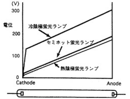 陰極降下電圧とは陰極直前の電位差で、ここで使われるエネルギーを電極損失といい、発光に寄与しないものである。陰極降下電圧の違いは,放電の担い手である電子の主体が熱電子であるか、γ作用による2次電子であるかによる。熱陰極で約10V、冷陰極はその電極構造、封入ガスの種類、圧力で異なるが、一般的に100V強である。セミホットはランプ電流20mAで約20Vである。第1図に蛍光ランプの電位分布の概念図を示す。高周波点灯のため陽極降下電圧は存在しない。
