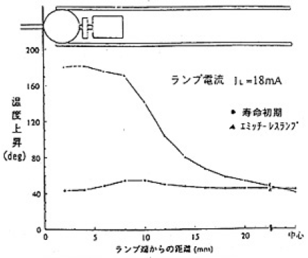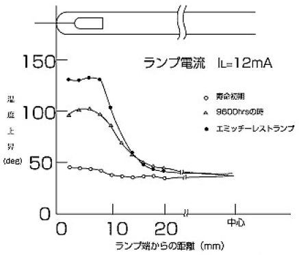しかし、寿命末期には冷陰極動作に移行し、陰極降下電圧の上昇を生ずる。その結果、ランプ電圧、ランプ電力が上昇し、電極付近の管壁温度が上昇する。 熱陰極動作を維持する時間はランプ電流によっても、またフィラメントコイルの線径によっても異なるが、ランプ電流13mAで約8000時間、20mAで約6000時間である。寿命特性を第5図に示す。なお、陰極動作に移行してもスパッターの発生は少なく、輝度維持率60%でみれば10000時間をクリヤーする。ランプ電流が大きい場合は、ランプ電圧の検知、ランプ電流付近の管壁温度の検知等による安全対策が必要となる。この点では、熱陰極蛍光ランプの属性を持ち合わせている。φ4.1セミホット蛍光ランプのランプ電流12mA流した時の管壁温度上昇を第6図に示す。エミッターレスを寿命末期と想定すれば管壁の温度上昇は約135deg.である。9600時間での温度上昇は約100deg.。135deg.に比較して低いのは、残っているエミッターがγ作用で機能するためと考えている。ランプ電流18mA流した時の管壁の温度上昇を第7図に示す。陰極動作に移行したと仮定したエミッターレスランプで電極付近の管壁温度上昇は約180deg.である。