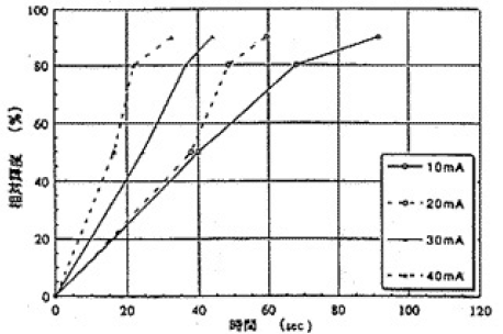 セミホット蛍光ランプの輝度立ち上がり特性を第8図に示す。屋外使用では冬に出画に時間がかかる、あるいは見えにくいという問題がある。セミホット蛍光ランプは、ランプ電流の大きい分、輝度立ち上がり時間が短く、冷陰極蛍光ランプよりは優れている。0°Cにおけるφ3.1セミホット蛍光ランプの輝度立ち上がり時間は約40秒である。この場合の輝度立ち上がり時間とは、25°Cにおける輝度の50%に到達する時間である。ちなみに冷陰極蛍光ランプの0°Cでの飽和輝度は25°Cの50%に達していない。ユーザー要求は10秒以内でありセミホットでもまだ改善が必要である。