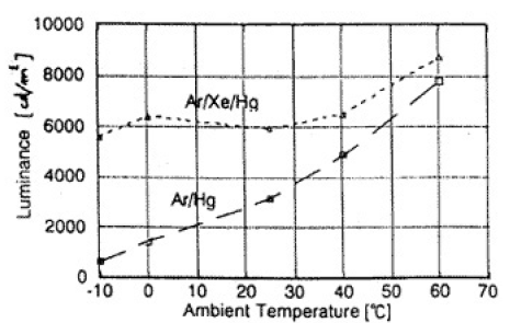 バッファーガスとして封入するガスはArが基本であった。封入圧力が高い程、電極のスパッターが抑制されて長寿命になる他に、陽光柱電位傾度も高くなる15)。一般照明用蛍光ランプ(熱陰極)の封入圧力は数百Paであるのに対して、細管のバックライト用蛍光ランプでは数千Pa以上に発光効率の最適値がある。ビューフィンダ用の短管のものは一万Paを越えている。封入圧力が高いと始動電圧も高くなる。その対策として、Ne-Ar系の混合ガスが採用されている11)。使用上の周囲温度も考慮して最適な混合比、封入圧力が選択されている。低温輝度改善では、Ar-Kr系の混合ガスも使われている。