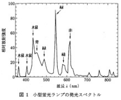 LCDの直視型用バックライトに使用されている小型蛍光ランプは,バルブ内面に希土類3波長蛍光体が塗布されている.蛍光体は,水銀の254nmの紫外線を可視光に変換し,水銀の可視光の輝度スペクトル(特に436nm)の重ね合わせで,色再現に適した効率の高い発光スペクトルが得られる.図1に代表的な蛍光ランプの発光スペクトルを示した.希土類3波長蛍光体は,赤(Y2O3:Eu),緑(LaPO4:Tb,Ce orMgAl11O19:Ce,Tb),青(SrCaBa)5(PO4)3Cl:Eu or(BaMg2Al16O27:Eu)の各波長域にピークを有している2)
