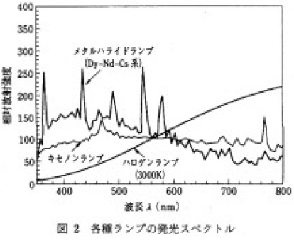 図2に示されるメタルハライドランプの発光スペクトルは,LCDプロジェクタのバックライトとして使用されている代表的なDy-Nd-Cs系ランプの例である.連続スペクトル分布を有し,色温度が7500K,発光効率が75lm/Wである.